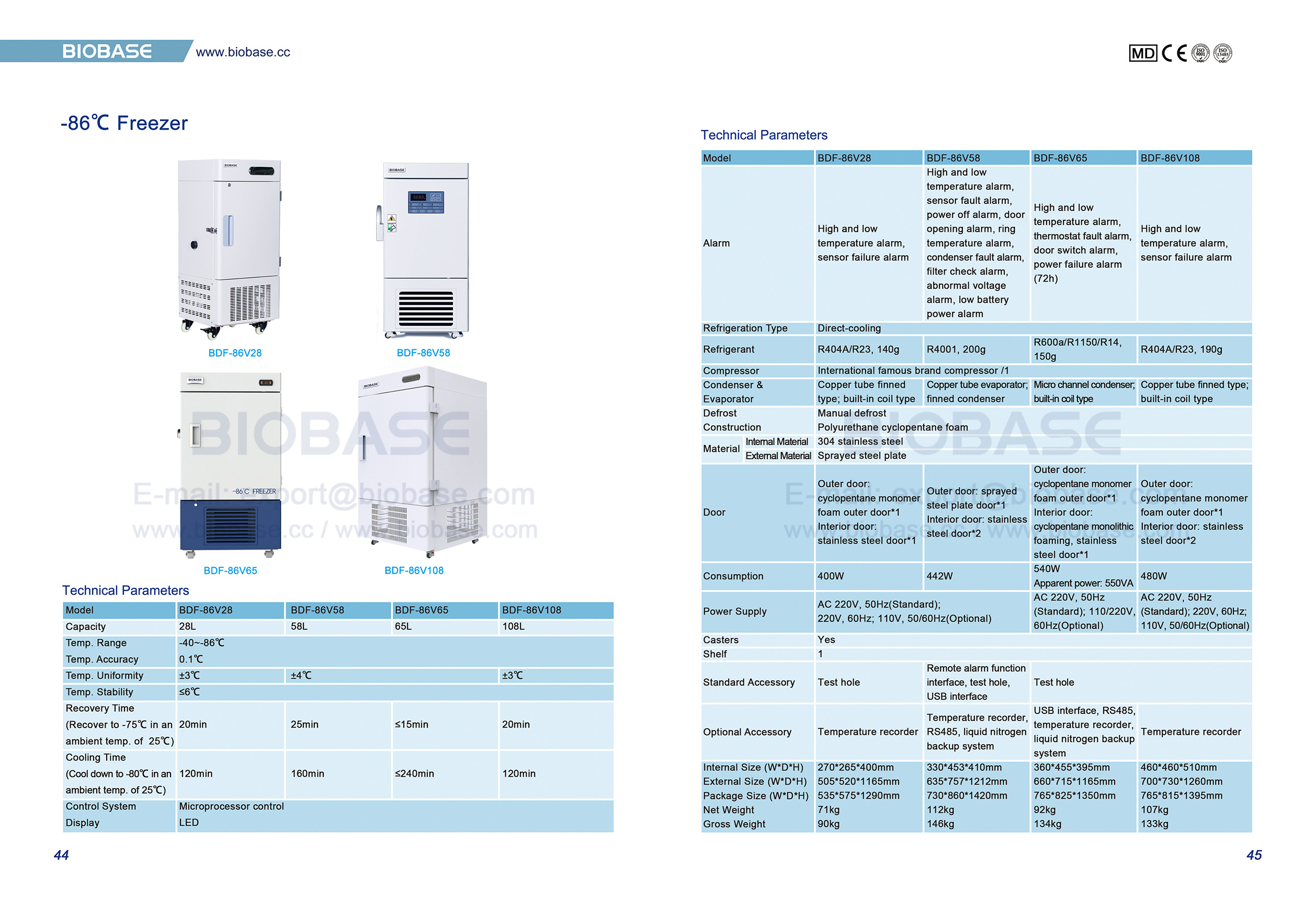 ตู้แช่แข็งอุณหภูมิต่ำ -86°C เป็นตู้ทำความเย็นอุณหภูมิต่ำพิเศษ (Ultra-Low Temperature Freezer) สำหรับใช้ในงานวิจัยทางวิทยาศาสตร์ งานด้านการแพทย์ วิศวกรรมชีวภาพ และสาขาที่เกี่ยวข้อง เป็นตู้ที่ใช้ในการสร้างสภาพแวดล้อมอุณหภูมิต่ำมาก เพื่อใช้เก็บรักษาตัวอย่างและวัสดุที่ไวต่ออุณหภูมิ เช่น ตัวอย่างชีวภาพ สารเคมี วัคซีน และตัวอย่างทางการแพทย์ต่างๆ ได้อย่างปลอดภัยและมีประสิทธิภาพ มีขนาด 28L 58L 65L และ 108L