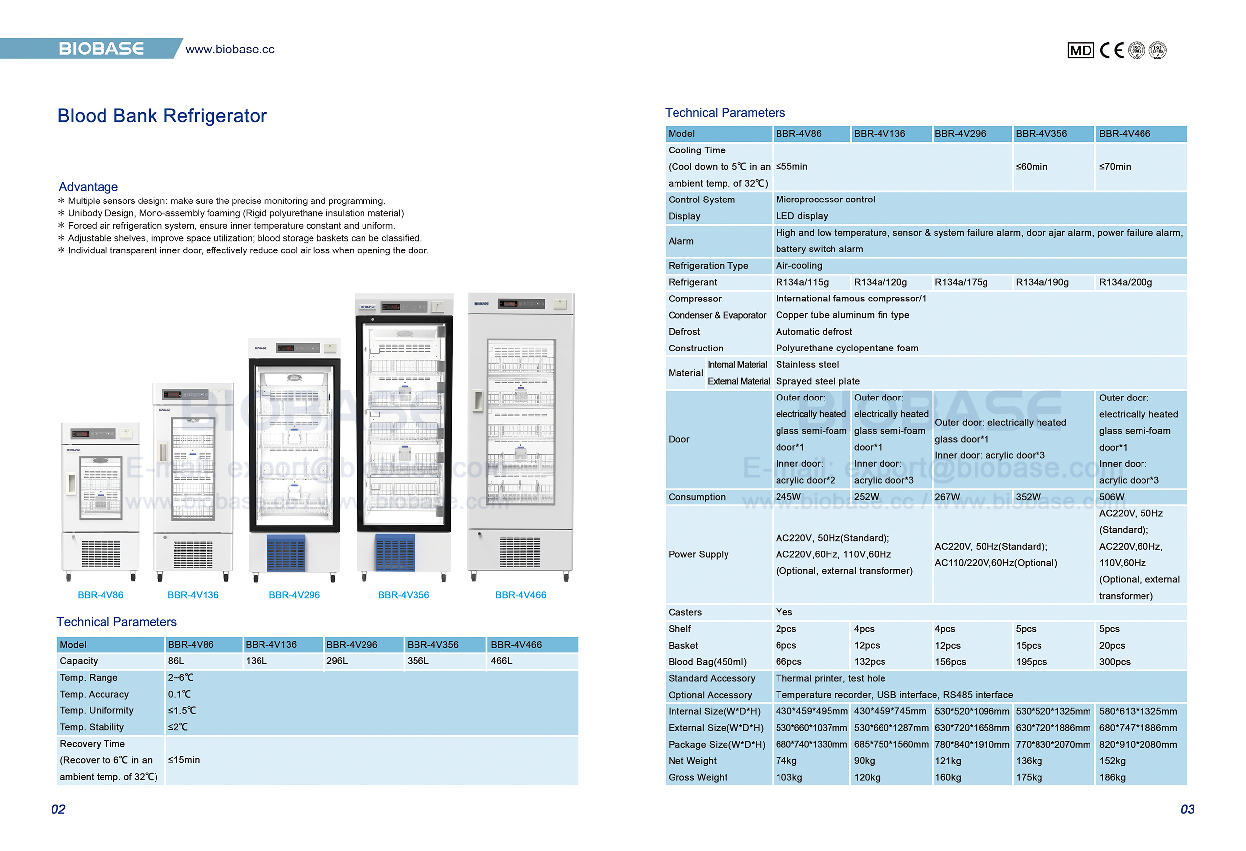 ตู้เย็นเก็บเลือด (Blood Bank Refrigerator) รุ่น BBR Series แบรนด์ Biobase มีหลายขนาด 86L, 136L, 296L, 356L และ 466L เป็นตู้ทำความเย็นที่ออกแบบเฉพาะสำหรับการจัดเก็บเลือดและผลิตภัณฑ์เลือด โดยสามารถควบคุมอุณหภูมิได้อย่างแม่นยำและมีความเสถียร เพื่อรักษาคุณภาพและความปลอดภัยของตัวอย่างเลือด เหมาะสำหรับใช้งานในโรงพยาบาล, ธนาคารเลือด, ห้องปฏิบัติการวิจัย, ห้องปฏิบัติการทางคลินิก, หน่วยงานทางการแพทย์