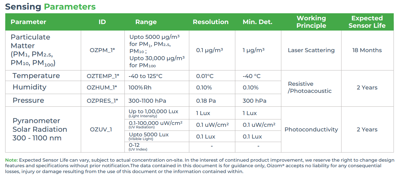 • วัดขนาดฝุ่นได้ตั้งแต่ 1 ถึง 100 ไมครอน (PM1, PM2.5, PM10, PM100) รวมถึงพารามิเตอร์อื่นๆ เช่น เสียง และความสั่นสะเทือน